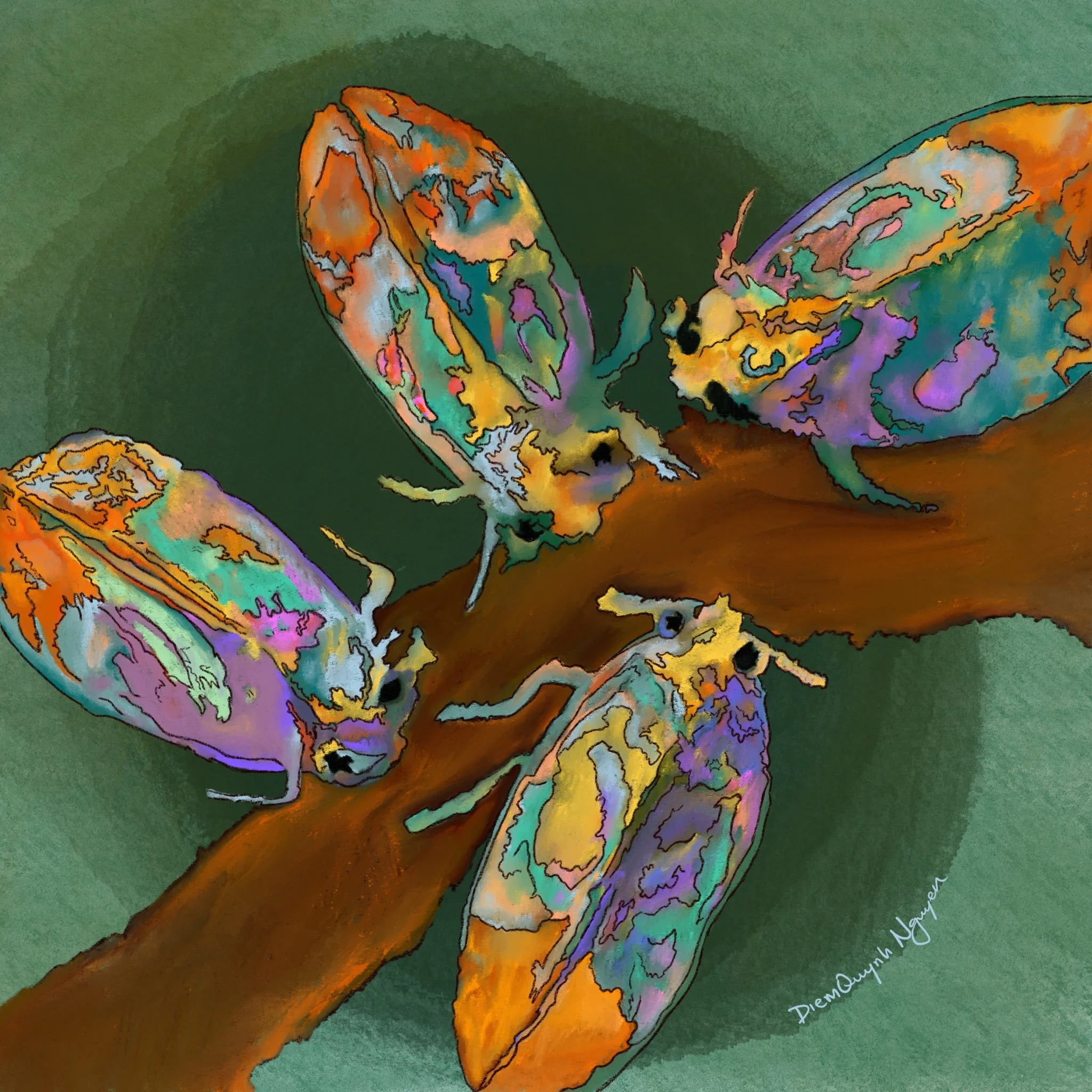 Growing up, I was surrounded by both art and nature. Paris By Night, a Vietnamese musical show blending modern pop, traditional folk songs, and sketch comedy filled our household with music and color. As a child, I was immediately captivated by its vibrant set designs, colorful dresses, and melodies. So much so that my summers were spent bringing my own version of the show to life in our backyard. I painted props and backdrops on recycled cardboard, learned songs, dances, and even convinced my siblings to join my background productions from time to time. In that same backyard was where my love for the natural world took root. I planted flowers, waited patiently for dragonflies to land, marveled at the shifting colors on the feathers of hummingbirds visiting our garden, and followed the winding ant trails that led to our nectarine and plum trees. It was there that my curiosity for both art and science began to flourish.